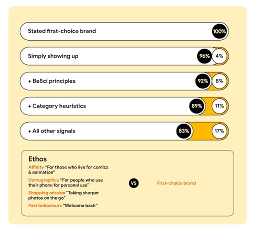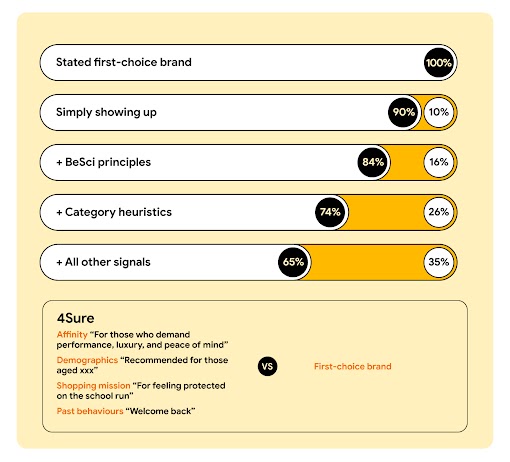 The combined impact of all these signals? We were able to help participants make the right choice for their unique needs based on the messaging provided. Across categories, a quarter of respondents selected the imaginary challenger brand over their original first-choice brand.3