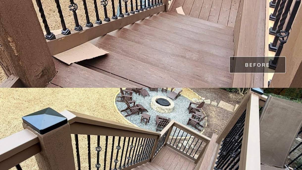 This deck showed natural wear and required carpentry repairs in several areas. Our team replaced damaged boards and reinforced key sections of the structure.